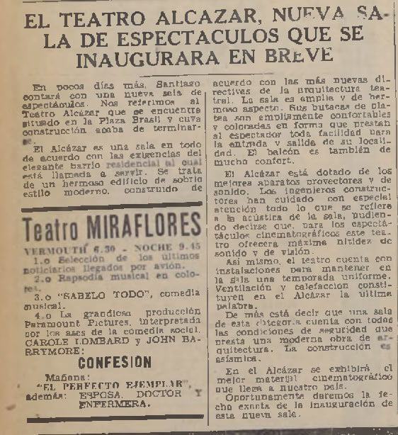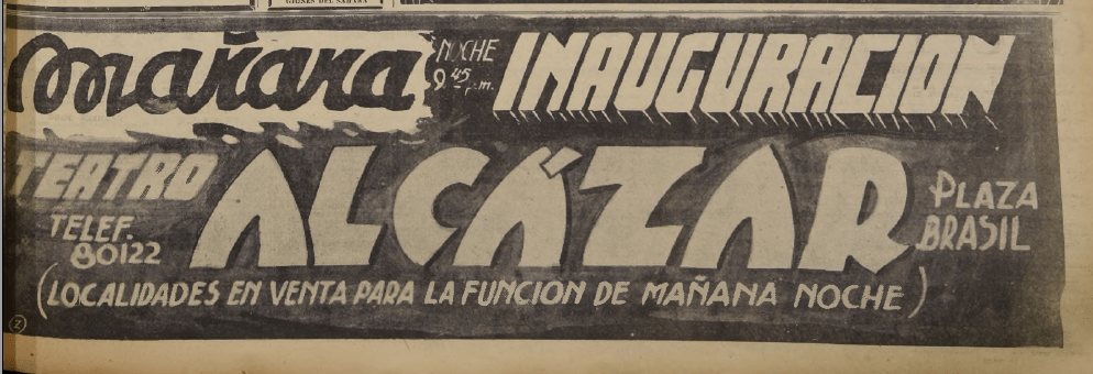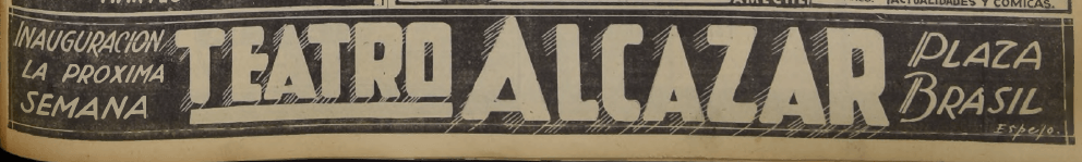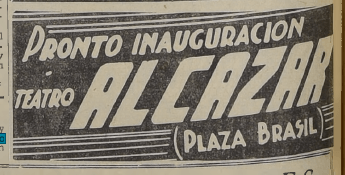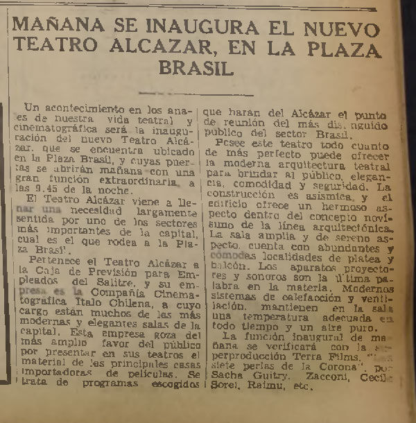 La Nación, “Mañana se inaugura el nuevo teatro Alcázar, en la plaza Brasil” Teatros y Cines, 12 abril 1938, p.9.