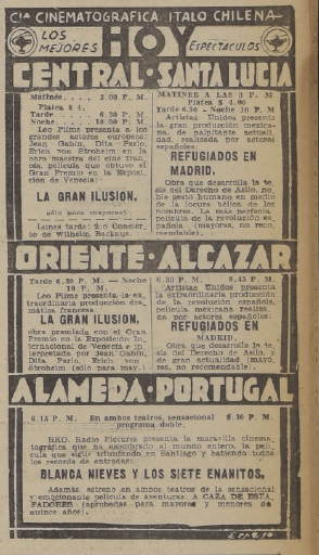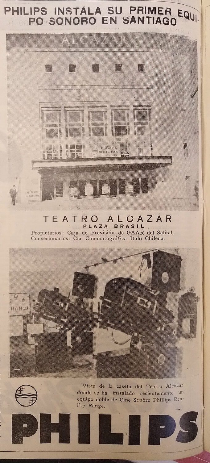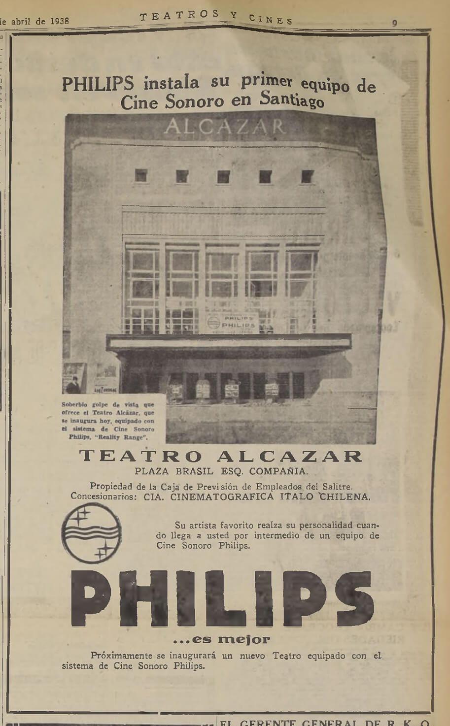 La Nación, “PHILIPS instala su primer equipo de Cine Sonoro en Santiago” Teatros y Cines, 13 de abril, 1938, p.9