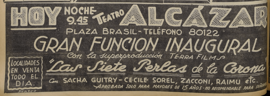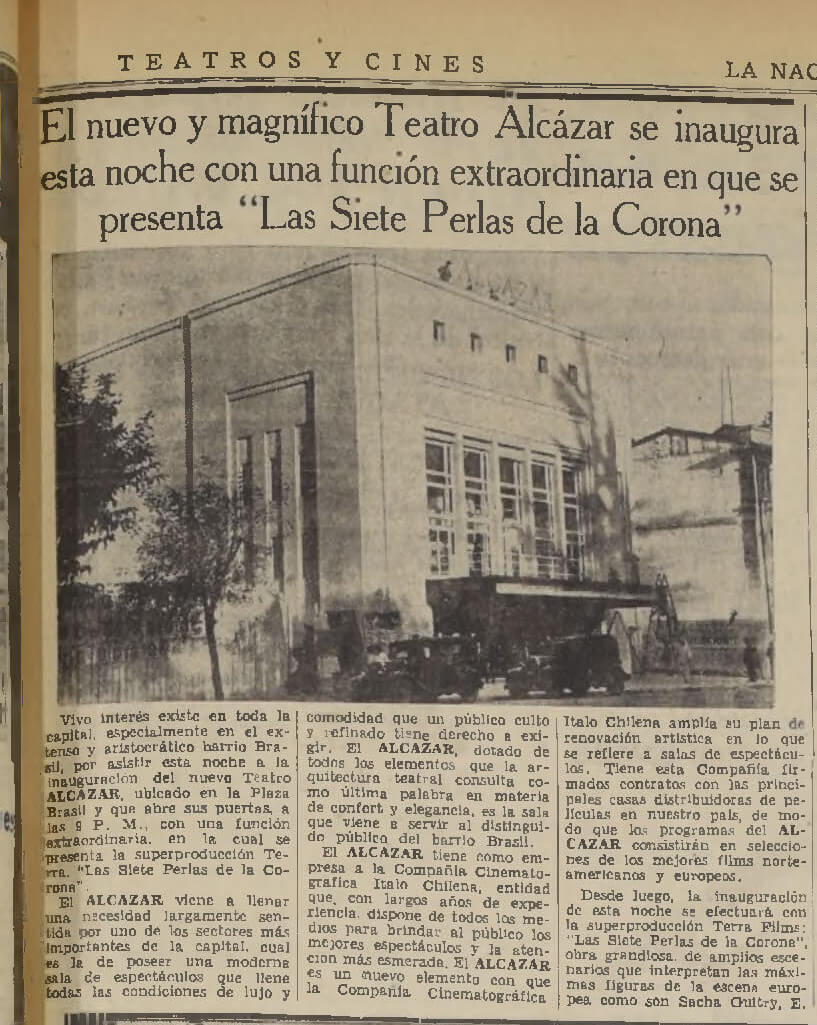 La Nación, “El nuevo y magnífico Teatro Alcázar se inaugura esta noche con una función extraordinaria en que se presenta Las Siete Perlas de la Corona” Teatros y Cines, 13 abril 1938, p.9.
