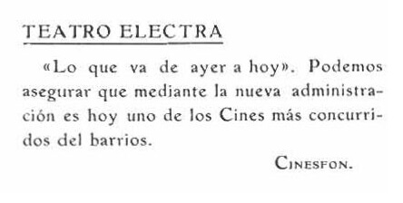 Chile cinematográfico nº1, “Teatro Electra” Cines y teatros, 25 junio 1915, p.15.